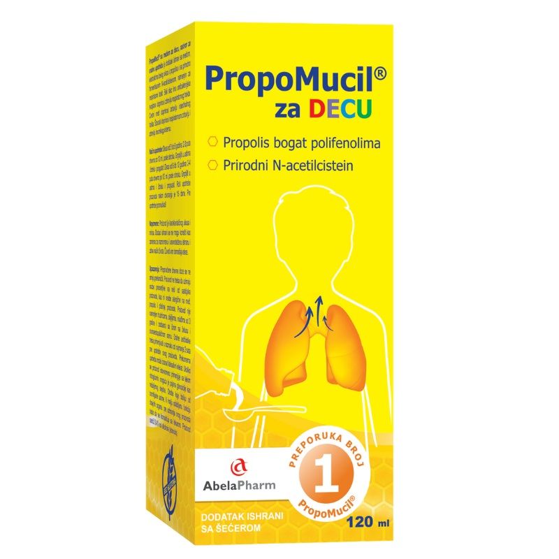 Propomucil со мед за деца помага во исфрлање на секретот од респираторниот тракт и зајакнување на имунитетот на детето. Прочистениот прополис како природен антимикробен лек ги смирува иритираните мукозни мембрани. Н-ацетилцистеинот како силен муколитик ги раскинува врските во густиот секрет претворајќи го во потенок секрет кој полесно се исфрла. Коренот од бел слез делува како антитусив. Овошјето од шипка има антиинфламаторно дејство. Медот како прв избор во терапија за акутна кашлица. Вкус на портокал.